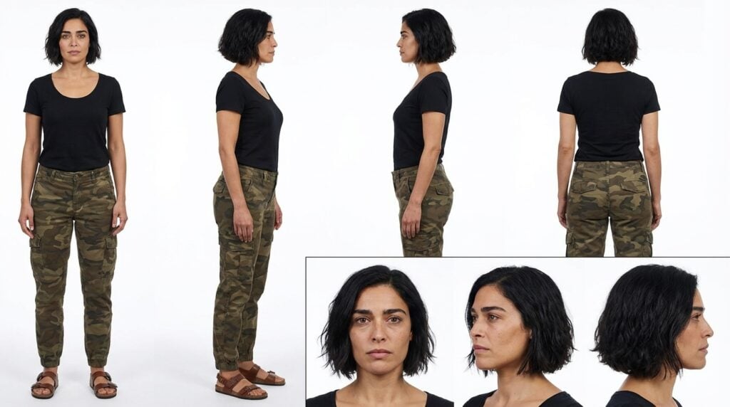 Character reference sheet of a woman with short dark wavy hair, four full-body views in a row on a clean white background: front view, left profile, right profile, back view. She wears a plain black scoop neck short sleeve shirt, camo cargo pants, and sandals. Relaxed standing pose, consistent identity across all views. Below, three close-up portrait views: front, left profile, right profile. Clean even studio lighting, sharp detail, print-ready technical turnaround sheet.