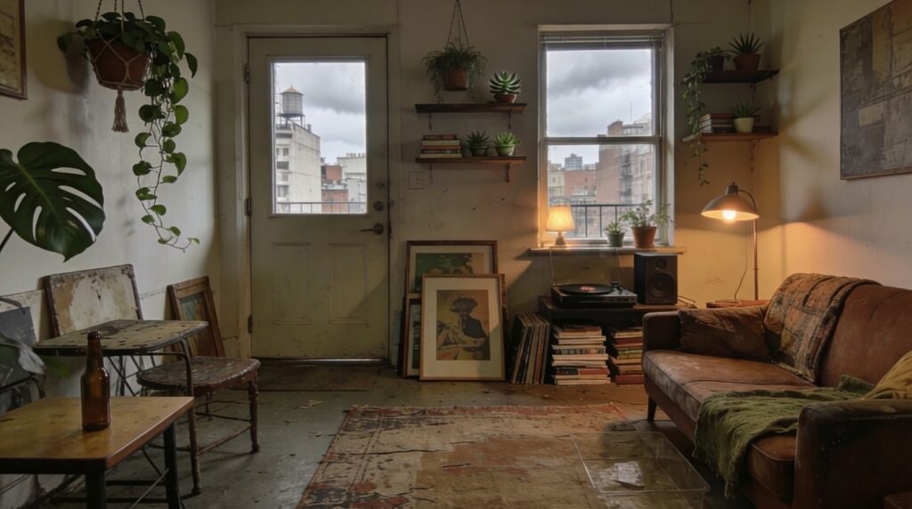 Wide interior shot of a city apartment, cozy and lived-in with a bohemian, artsy feel. Lots of plants (hanging pothos, potted monstera, small succulents on shelves), mismatched vintage furniture, a worn rug, stacked books, framed prints leaning against the wall, a small record player or speaker, and a soft lamp glow. A couch sits to one side. By the front door: a small table with a key dish. Late afternoon overcast window light mixed with warm practical lamps, soft shadows. Muted earthy palette (warm browns, olive greens, faded textiles), slightly desaturated. Realistic, cinematic, 35mm film look, subtle grain, natural lens softness, no HDR, no stylized effects, no text or watermark.