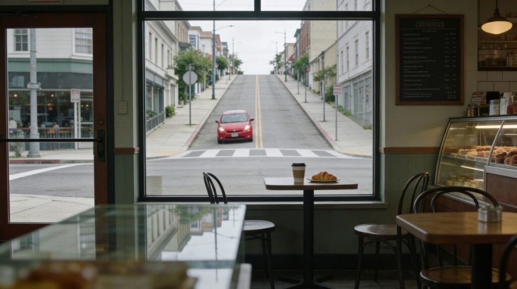 Cinematic interior wide shot of a street-level coffee shop, camera inside near the entrance looking toward a large picture window. @Cleo sits at a small table on the right side of frame, her back to the window and her face turned slightly toward camera. She is wearing a plain black scoop neck short sleeve shirt, camo cargo pants, and flat sandals. On the table: a coffee cup and a croissant. Through the window, a T-intersection is clearly visible: a downhill street runs perpendicular straight toward the café window, and a cross street runs left-to-right parallel to the sidewalk. A red compact car is coming downhill directly toward the café, centered in the window view on a clear collision path. Keep the middle of frame open so the car’s impact path is unobstructed. Realistic coffee shop details: menu board, pastry case or counter in soft focus, other tables and chairs, subtle reflections on the glass. Overcast daylight outside, soft natural interior fill. Muted slightly desaturated colors, 35mm film look, subtle grain, natural lens softness, no HDR, no stylized effects.