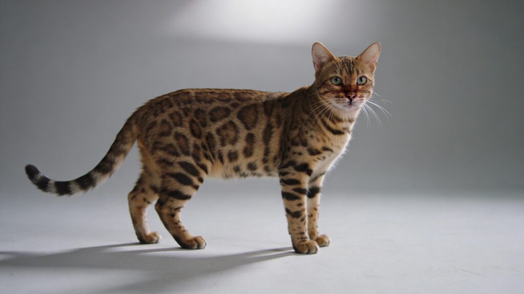 cinematic shot of a Bengal cat on a clean plain light-gray seamless background. Shot as studio photography on a 50mm lens at eye-level. Natural directional lighting with subtle overhead spill and gentle side contrast, soft controlled shadows on the floor. Slightly desaturated color grade. Soft film grain, natural lens softness, realistic exposure, cinematic film still look, grounded realism. Print-ready technical turnaround sheet. No props, no environment, no text, no watermark.