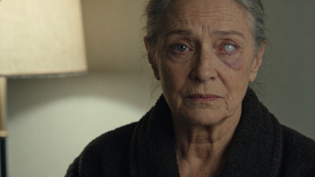 Cinematic head-and-shoulders portrait of an older woman in her late 60s with a lined, intelligent face and steady presence. Both eyes fully open and facing forward. One eye has a cloudy, milky-white cornea — opaque and desaturated — but the eye is not rolled back, not closed, and not looking upward. The pupil remains centered and natural. The other eye is sharp and observant. Gray hair loosely pinned back. She wears a simple dark wool robe with heavy texture, understated and practical. Calm, unreadable expression with quiet gravity. Natural skin texture with visible age lines. Soft practical interior lighting from a nearby lamp, gentle shadow falloff, muted earthy palette, slightly desaturated. Realistic contemporary photography, 35mm film look, subtle film grain, shallow depth of field.